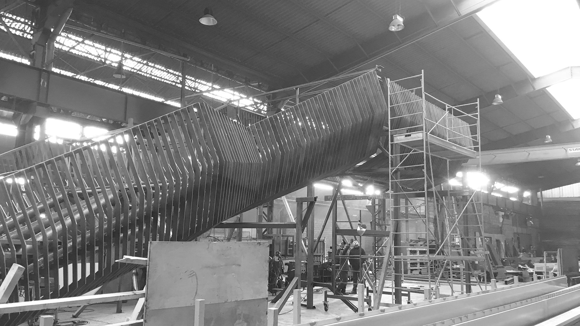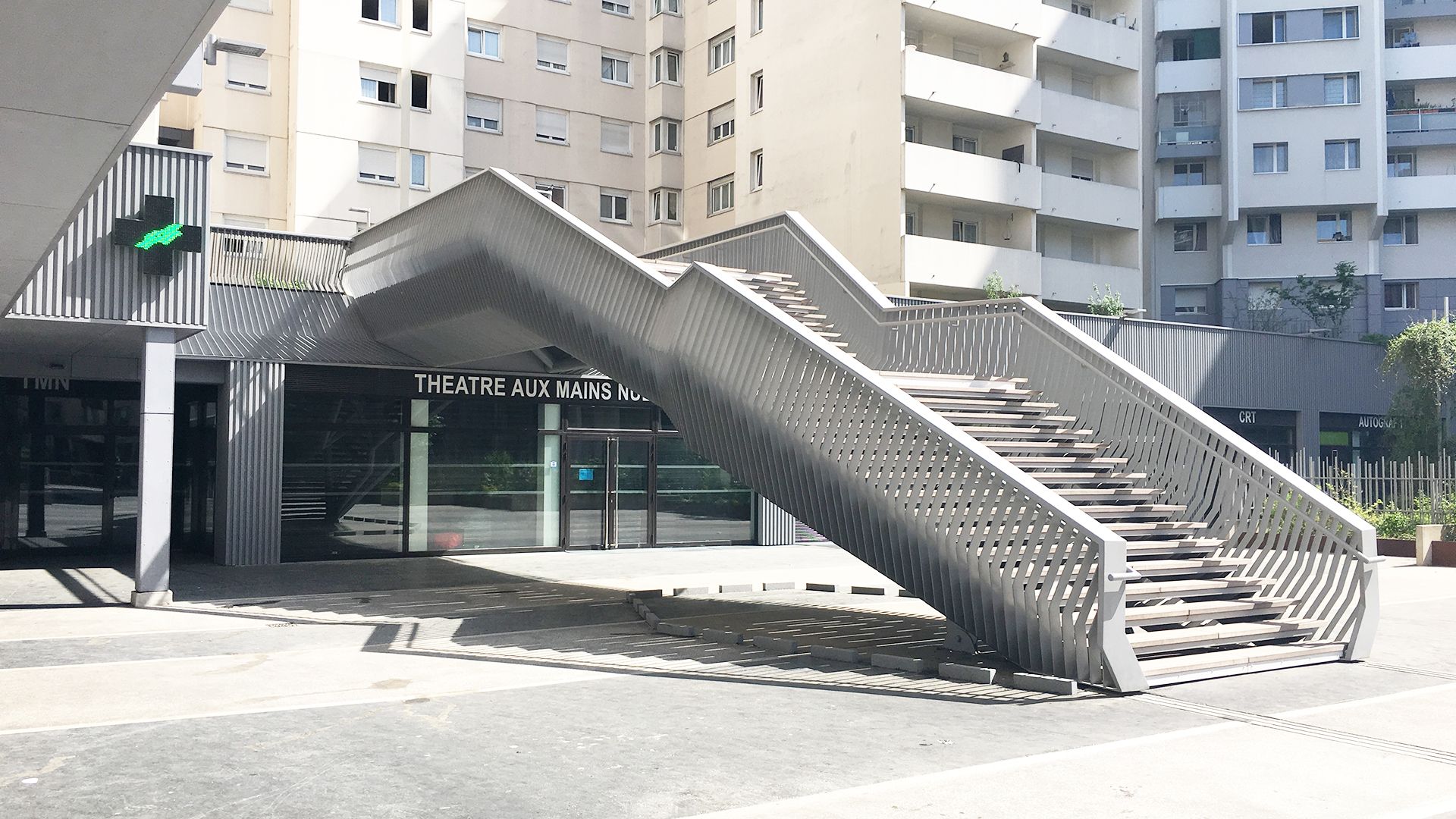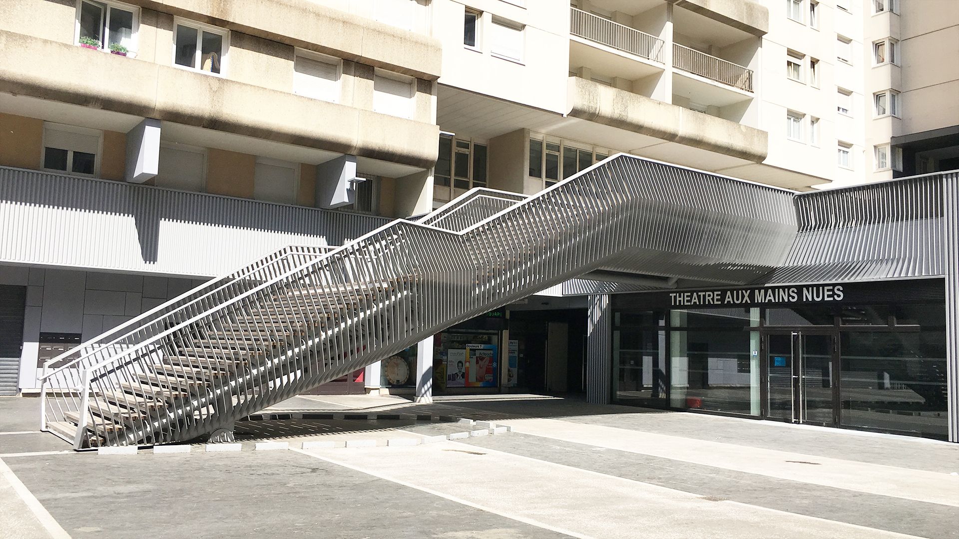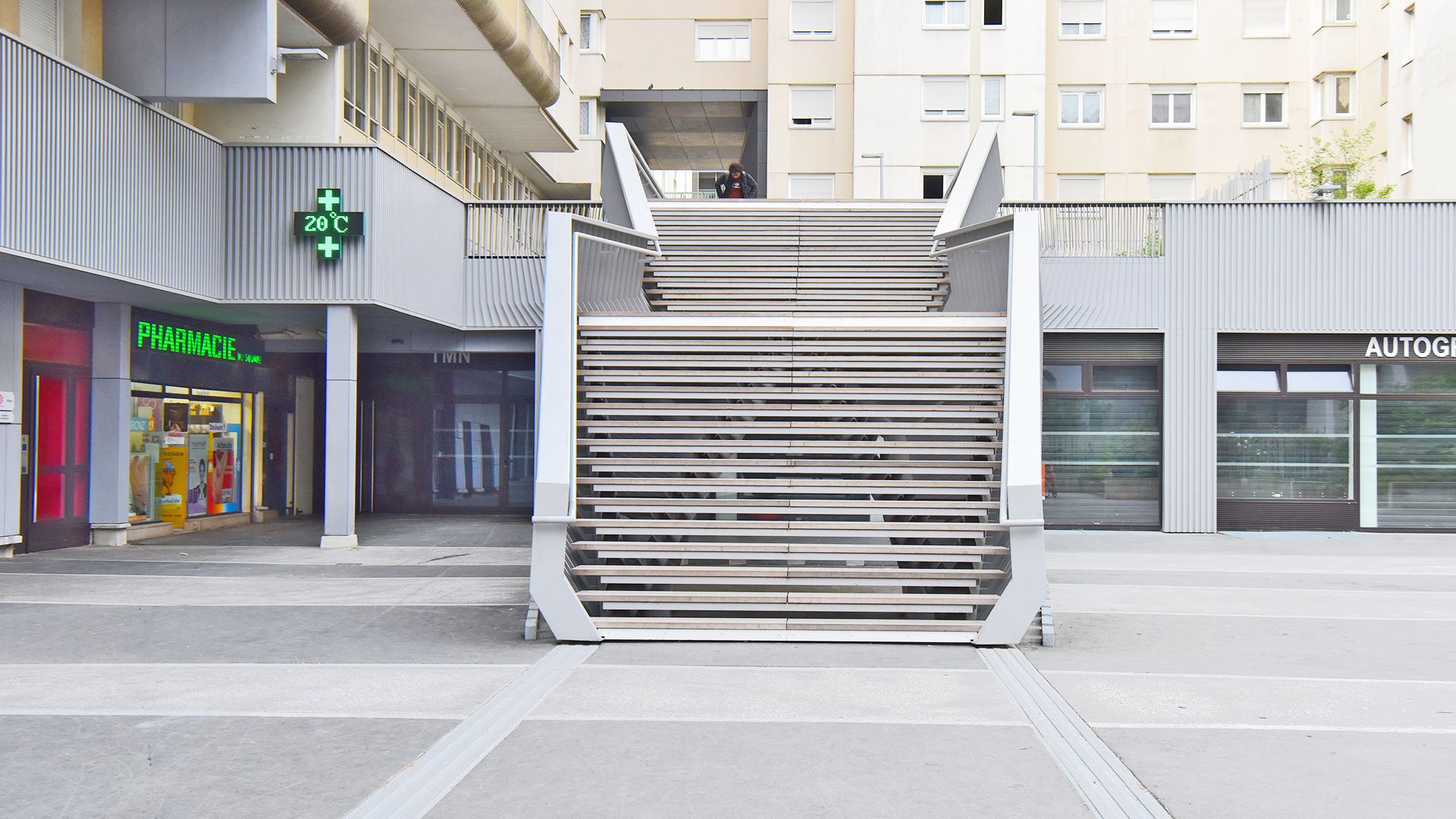 Chafik Studio et CPLG Architectes participent à la réhabilitation de la place du Square des Cardeurs dans le 20ème arrondissement de Paris. Chafik dessine pour l’occasion un escalier monumental dans un rythme de métal très musical.