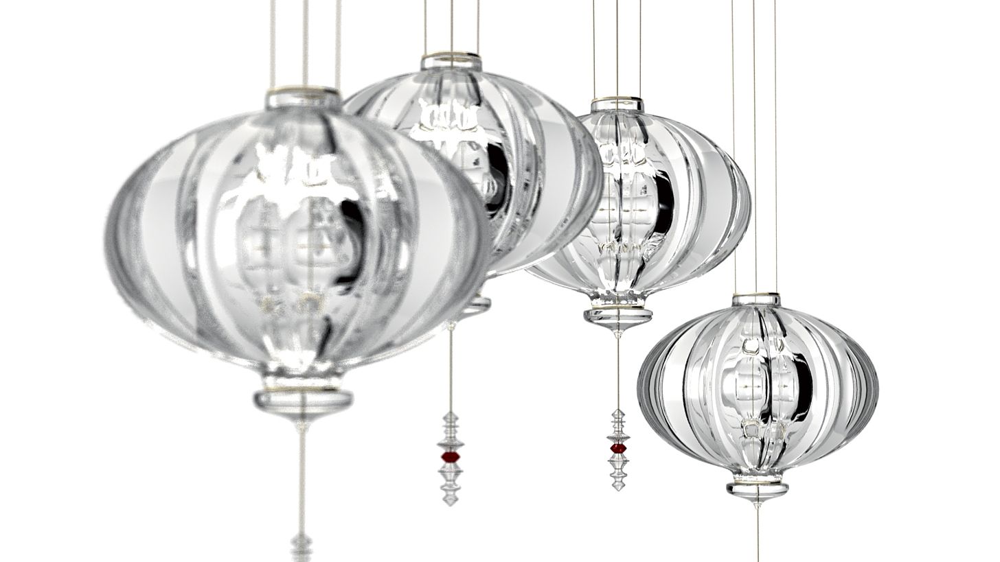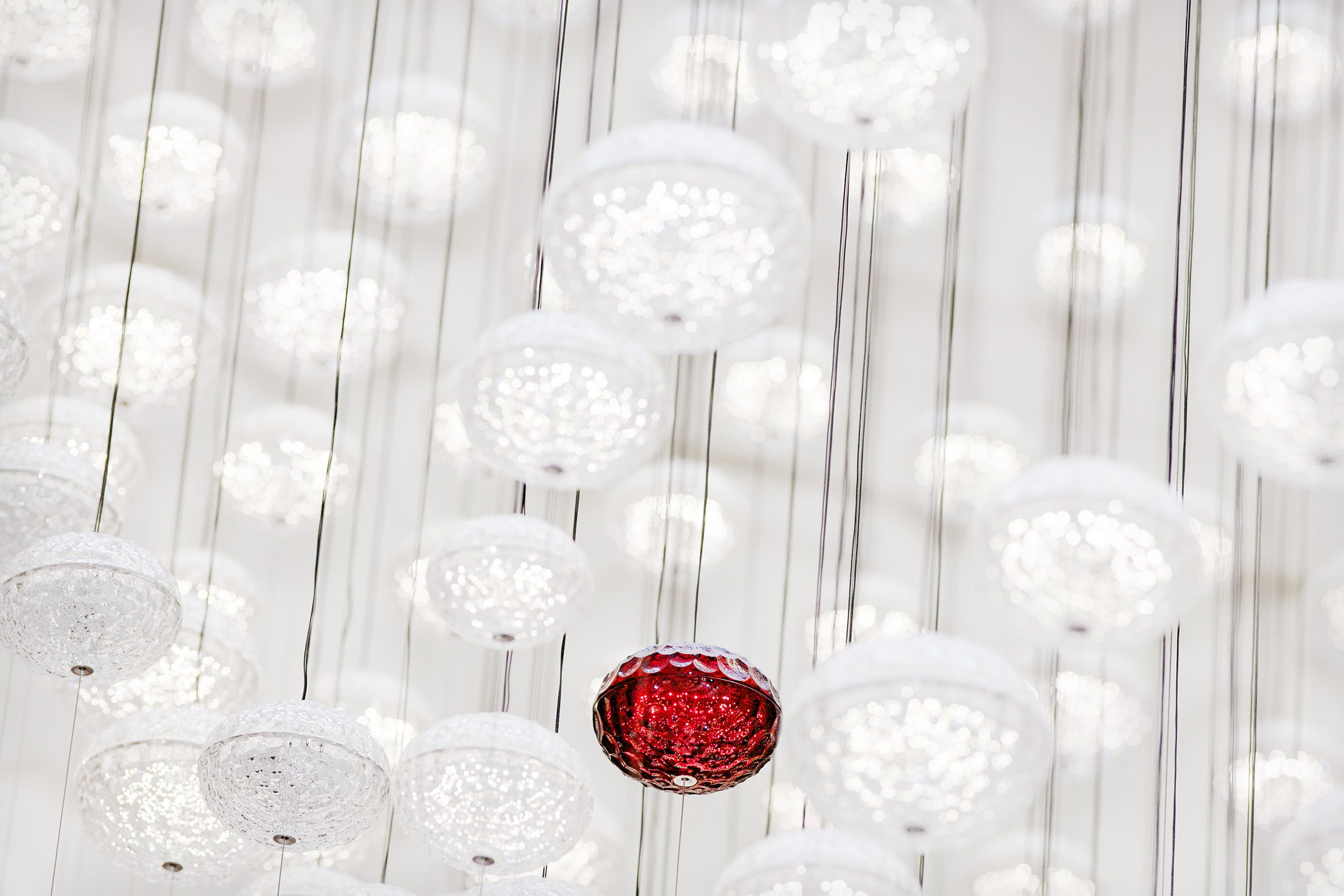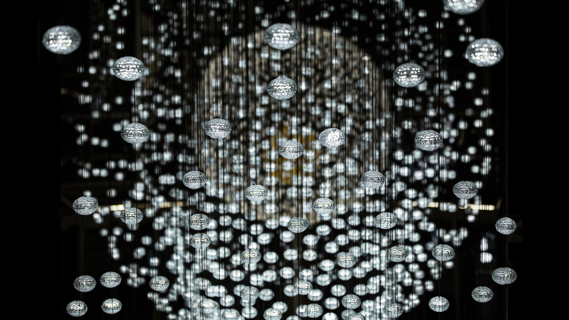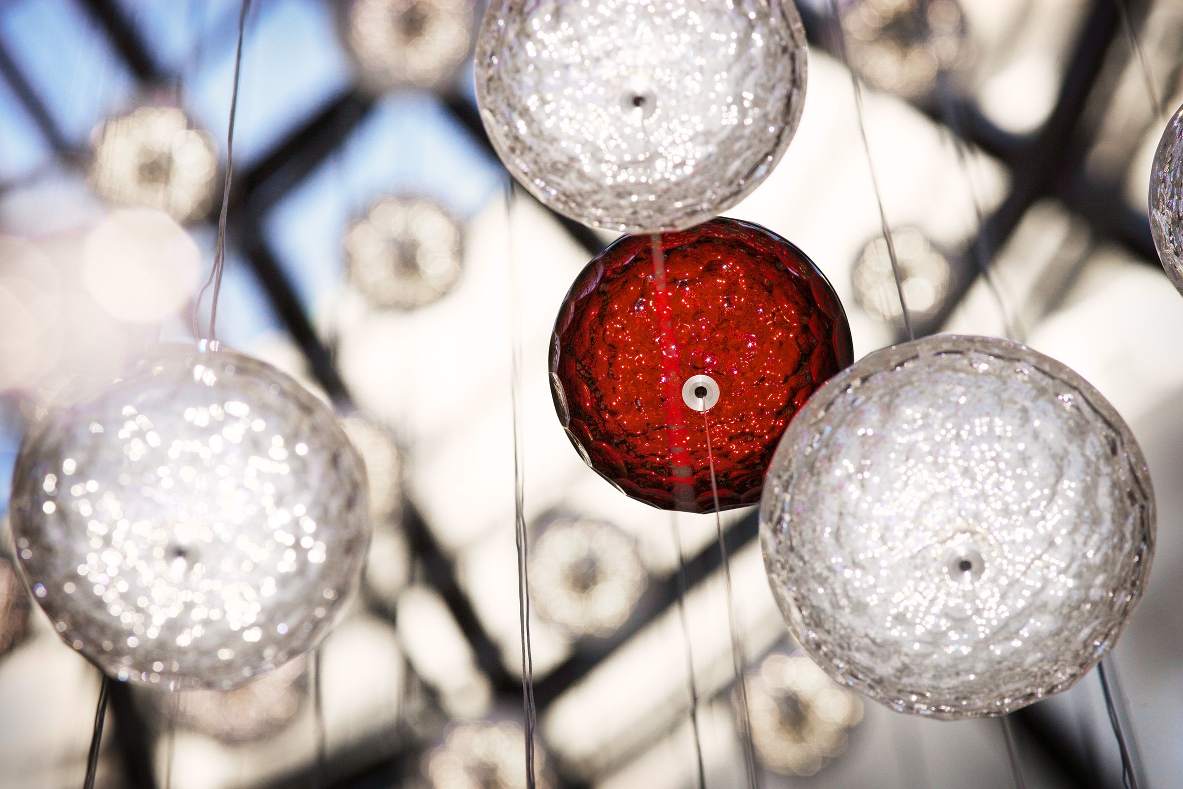 For this chandelier, Chafik designed a sphere made of 1000 clear crystal bubbles at the heart of which he placed a 1001st red crystal bubble in reference to the red tassel which traditionally adorns and distinguishes Baccarat chandeliers.