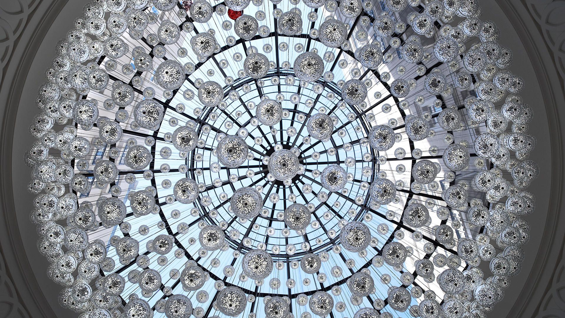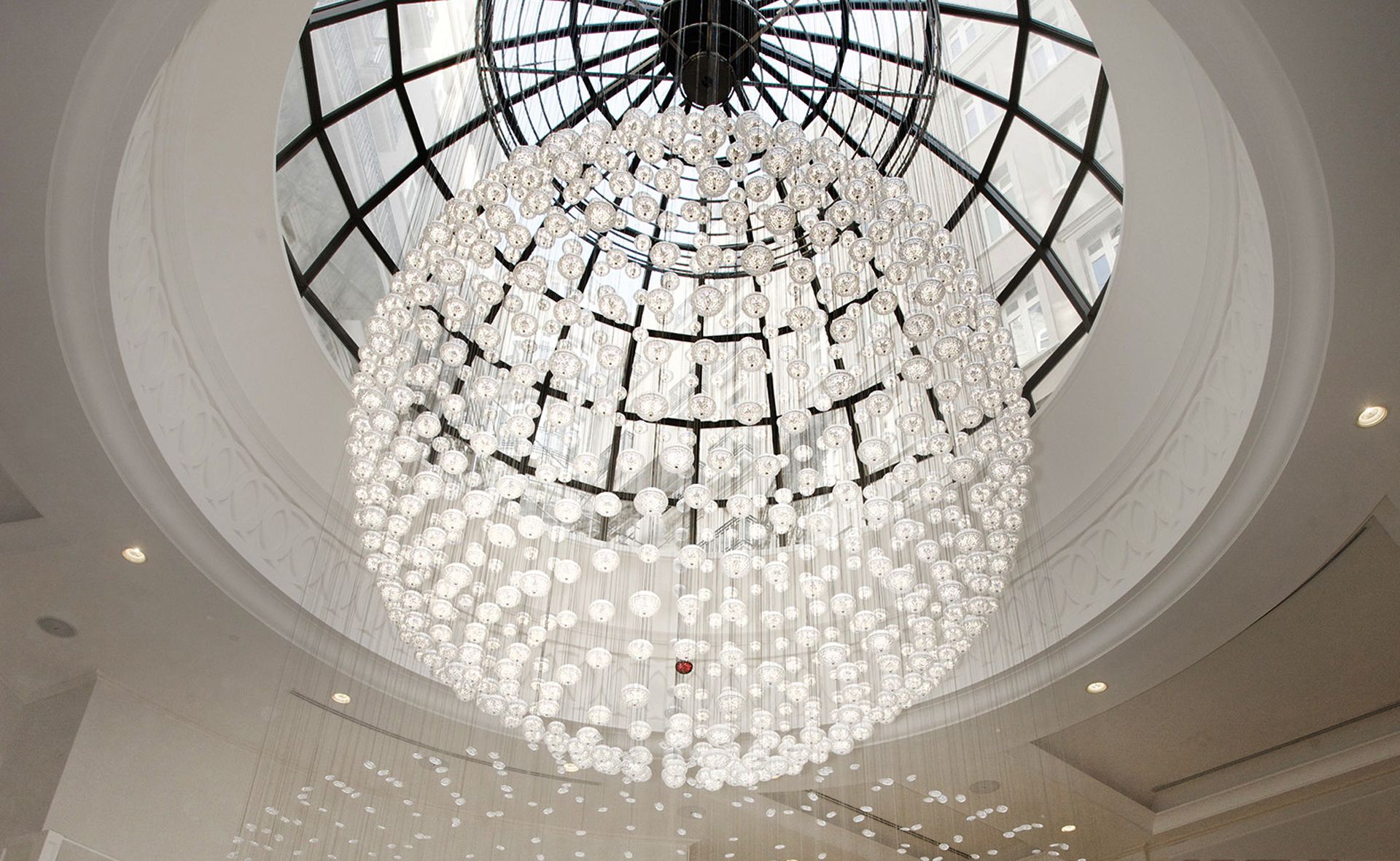 The Fullmoon chandelier, created by Chafik Studio and produced by Baccarat, lights up the lobby of the Corinthia Hotel in London, which opened on May 9th, 2011. Installed under the glass dome of the lobby, the Fullmoon chandelier and its constellation of crystal bubbles is one of the main centres of attention of the Hotel’s lobby.