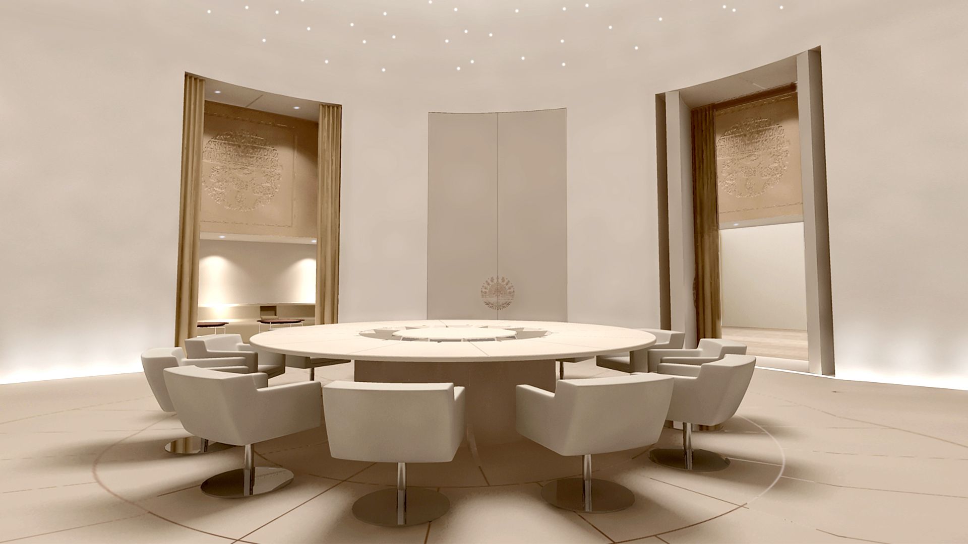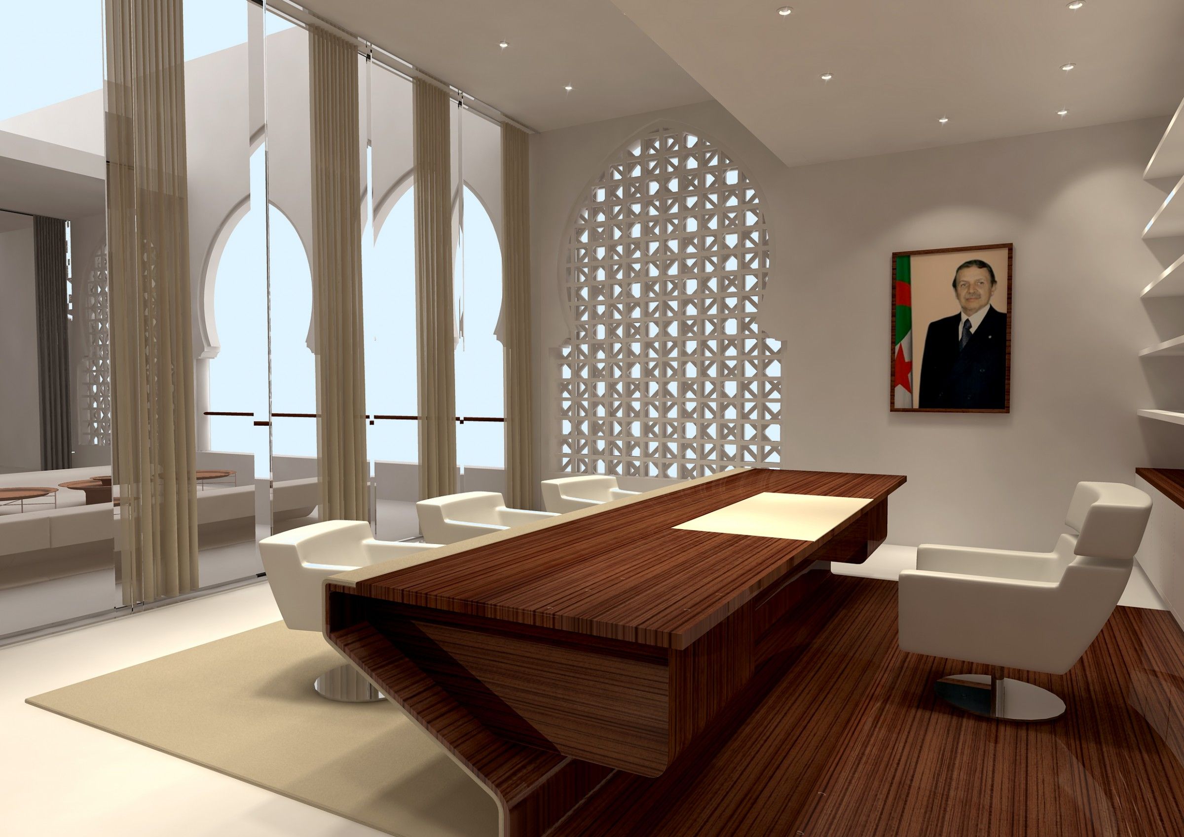 Chafik dessine pour le Ministère des Affaires Étrangères de la République Algérienne les étages nobles du ministère et de ses collaborateurs incluant le bureau du ministre, la salle des banquets, la salle des actes et sa terrasse donnant sur la baie d’Alger avec un style intemporel réinterprétant le patrimoine algérien.