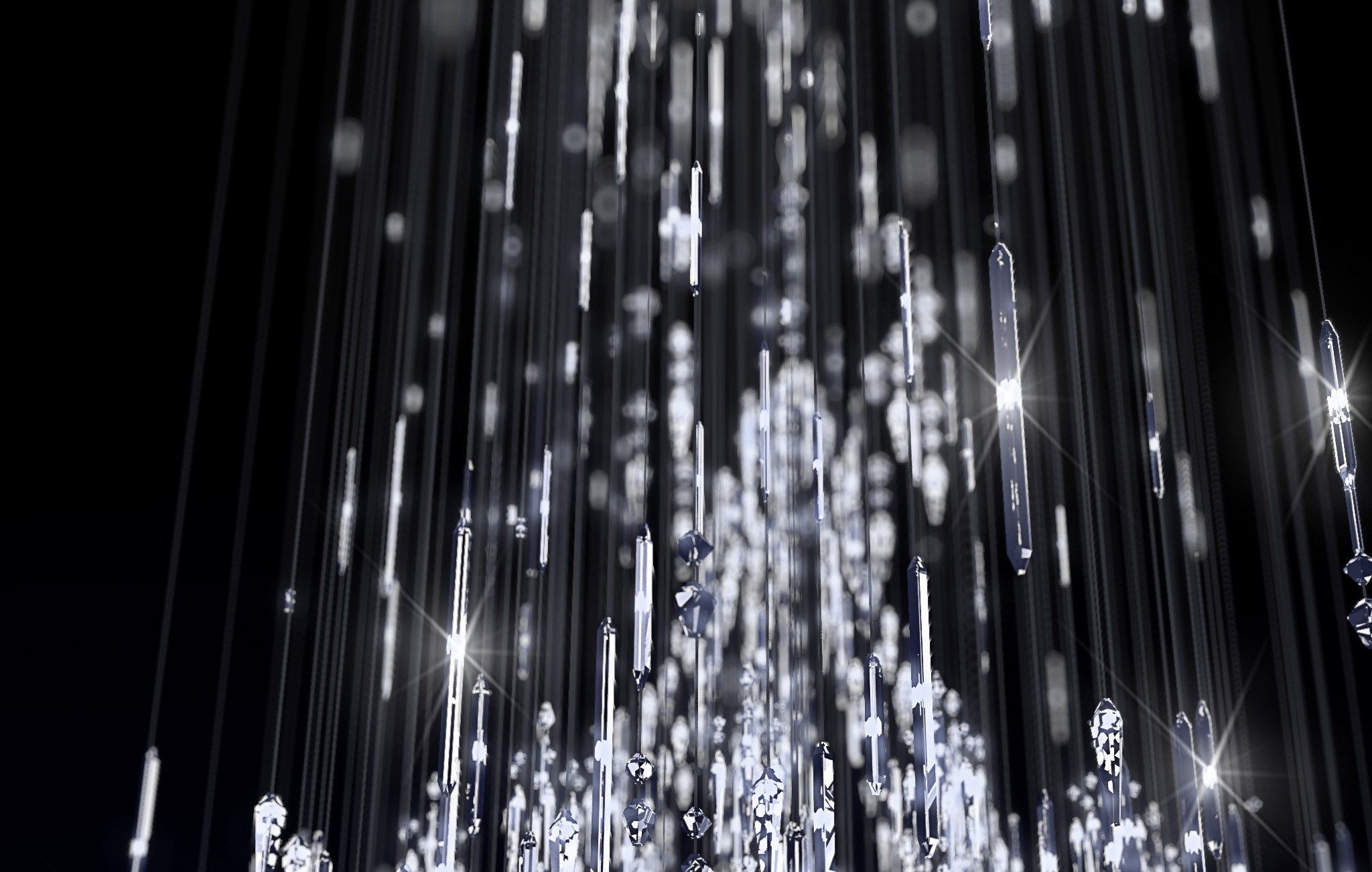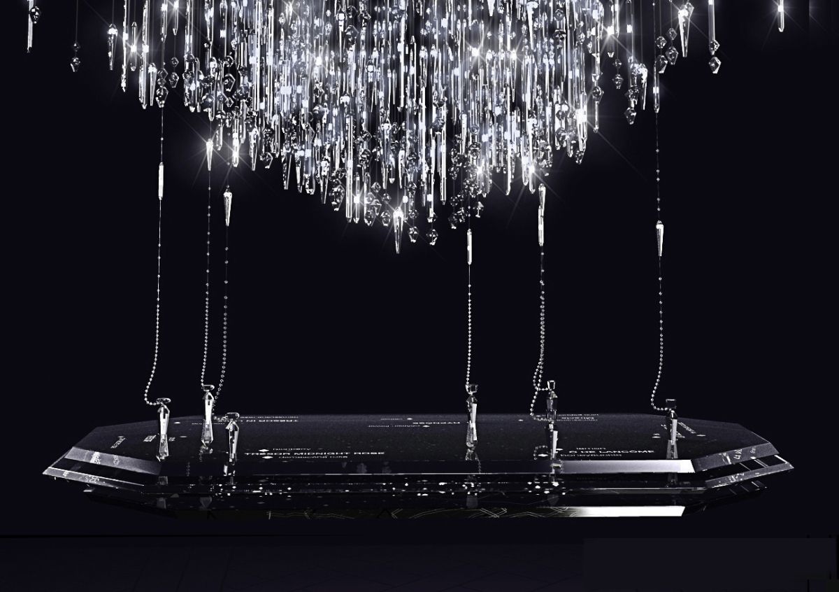 Une pluie de cristal suspendue entre la voûte céleste des ingrédients de lumière et leur composition olfactive orchestrée sur la table d’expérience des grands parfums Lancôme.